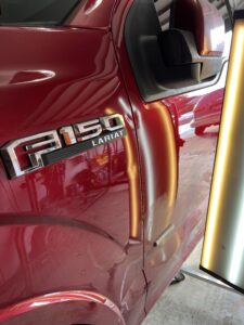 The dents in the picture are on an aluminum panel, so it takes a master in the paintless dent repair field to repair this dent properly, like Lord of the Dings. The location of the dents is on the driver’s front door and the driver’s side fender. Also, there is no picture of this, but in order to repair this dent, Lord of the Dings had to remove the interior trim panel. When removing the panel. It was discovered that the panel was broken in multiple places.