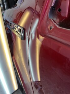 The dents in the picture are on an aluminum panel, so it takes a master in the paintless dent repair field to repair this dent properly, like Lord of the Dings. The location of the dents is on the driver’s front door and the driver’s side fender. Also, there is no picture of this, but in order to repair this dent, Lord of the Dings had to remove the interior trim panel. When removing the panel. It was discovered that the panel was broken in multiple places.